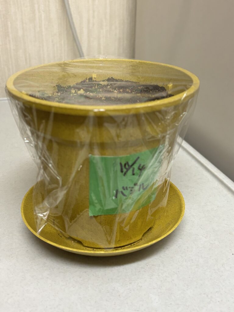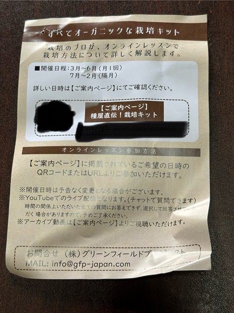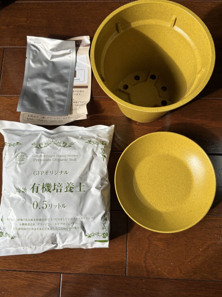 鉢と受け皿(プラスチック製)、有機培養土(0.5リットル)、バジルの種(10粒ぐらい)、『栽培入門者向けのYouTube動画のURL』が記載された紙